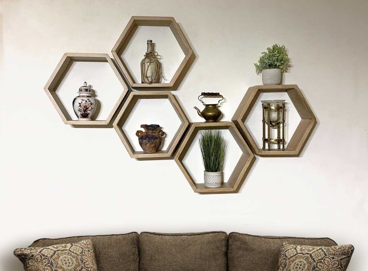 Get a modern and fresh interior designed space with the ready-to-hang 6-sided hexagon shelves. Perfect for small knick-knacks to display in a little space. Hexagon shelves are very versatile because the honeycomb shape allows for many design variations.